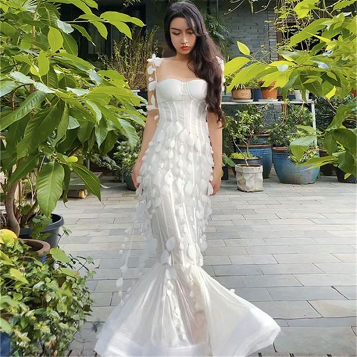 (2E)EEE French long white feather flower dress summer light luxury heavy sexy tube top sling fishtail holiday dress