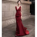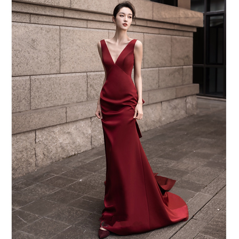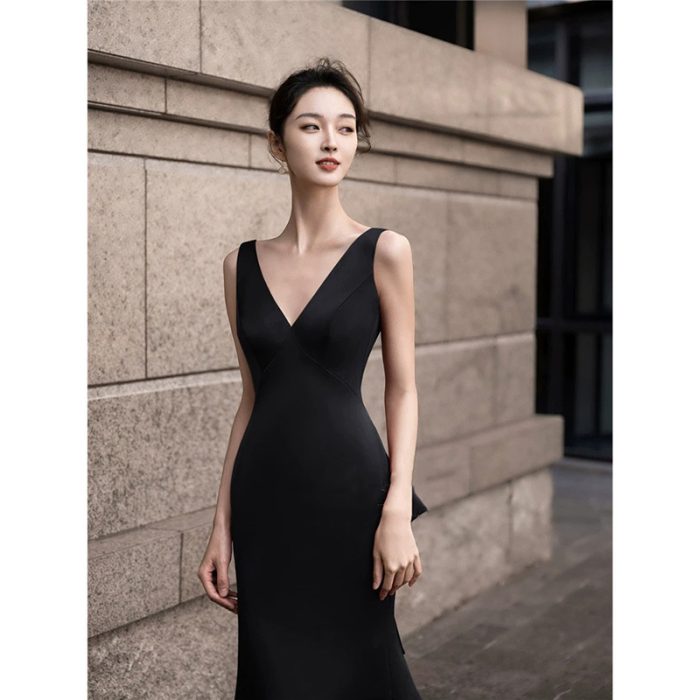 KKK European and American banquet evening dress 2024 new V-neck black dress light luxury lady temperament slim fishtail dress