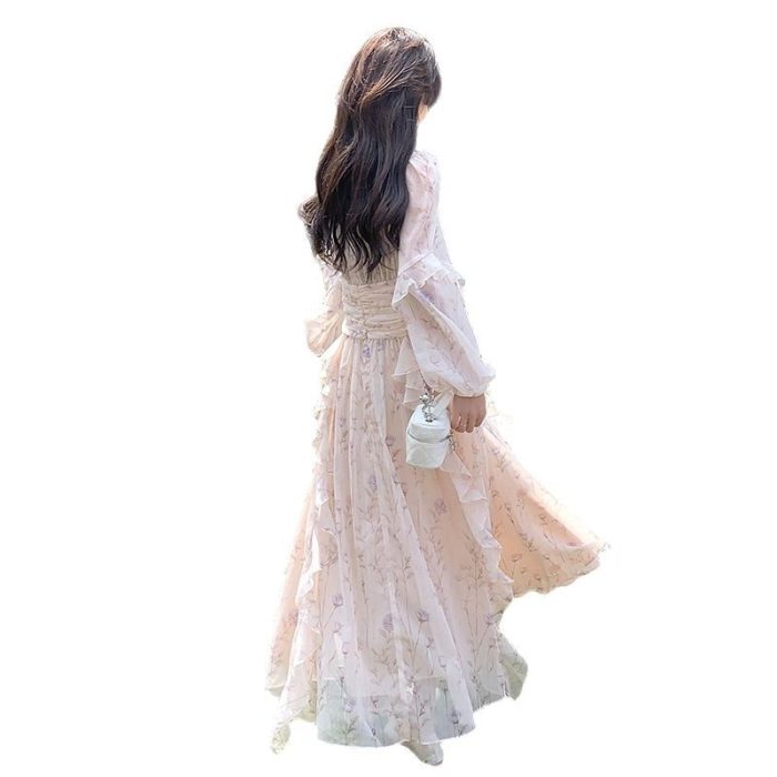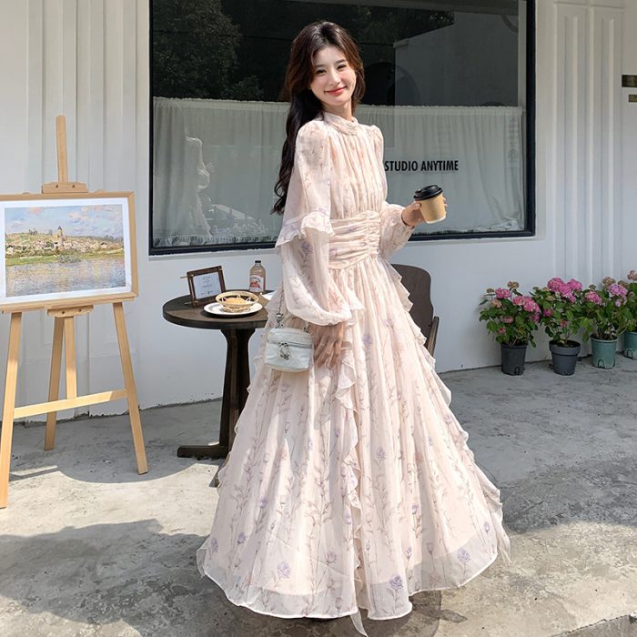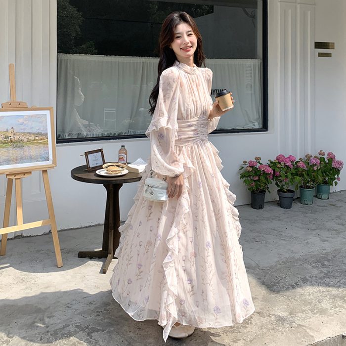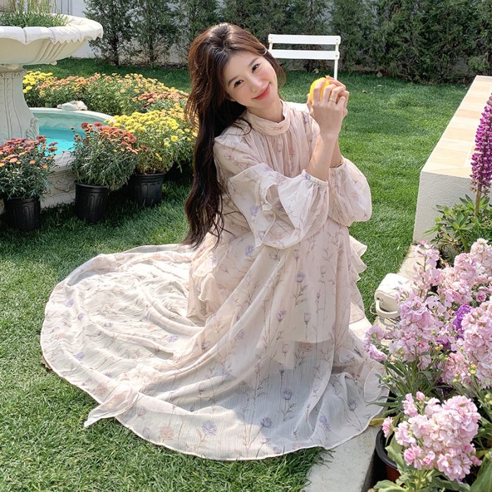 VVV ruffled floral long-sleeved dress new style beautiful French Chanel style chiffon skirt