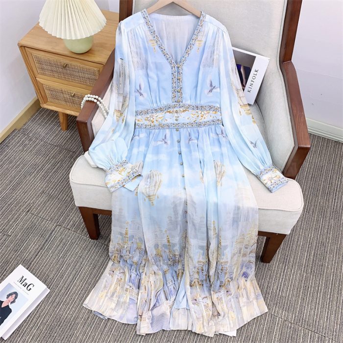 E24New temperament V-neck casual high-waisted long-sleeved pocket solid color cardigan dress
